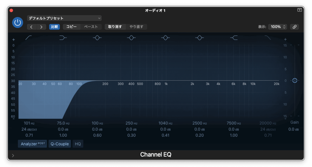大体100kz以下の音は不要になるので、ここは初めからバッサリ切っちゃっても良いと思います。